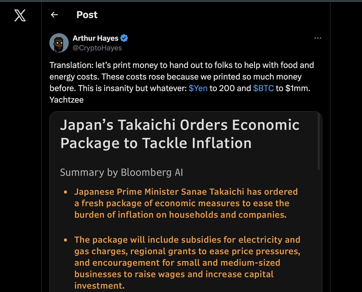 Arthur Hayes előrejelzése szerint a bitcoin elérheti az 1 millió dolláros értéket, miután Japán új miniszterelnöke, Sanae Takaichi bejelentett egy jelentős ösztönző csomagot, amely új likviditást indíthat el és globális kockázati eszközök emelkedését válthatja ki.