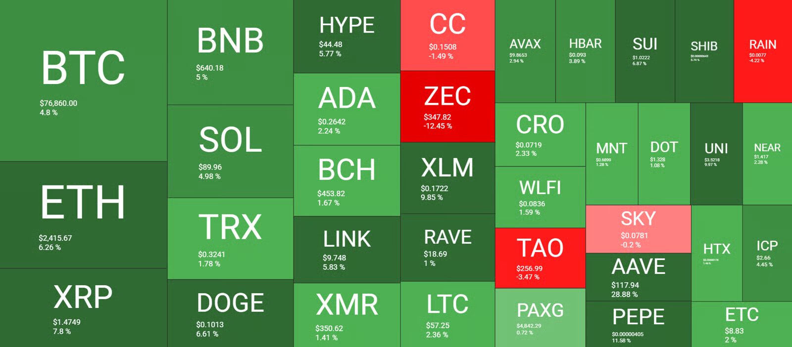 A Bitcoin árfolyama azonnal reagált: rövid időre 78 ezer dollár fölé emelkedett, ami hónapok óta nem látott szint. A heti teljesítmény így már 5% körüli pluszban van, ami azt jelzi, hogy a befektetők gyorsan visszatérnek a piacra.