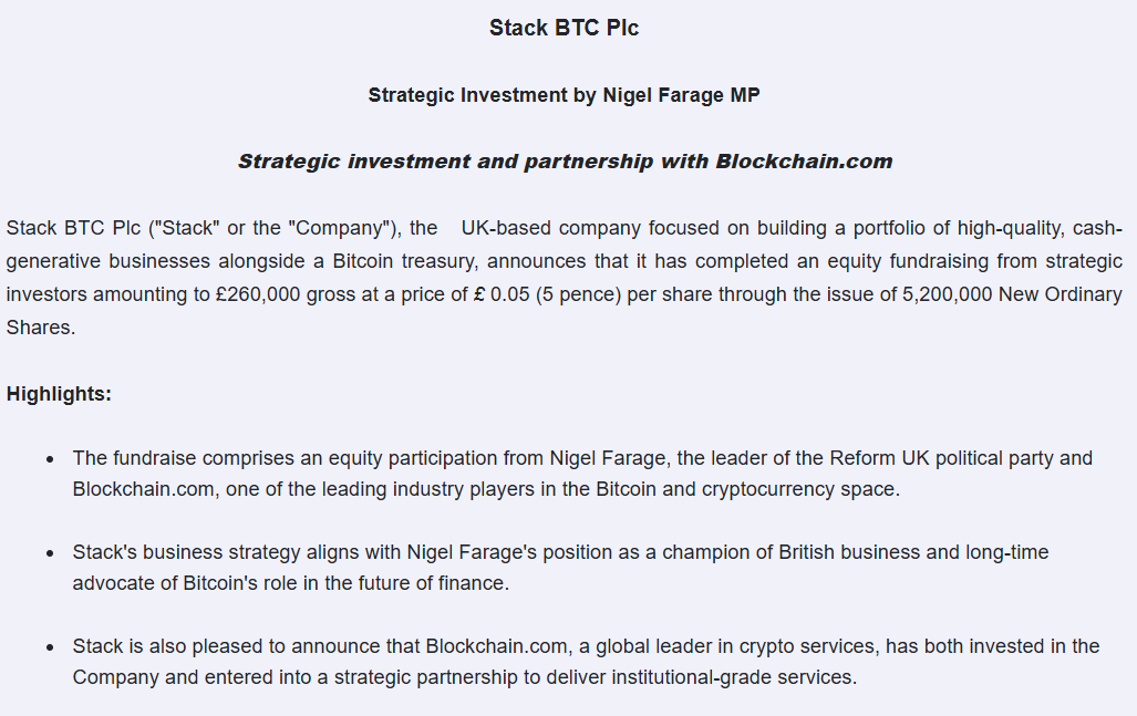 A befektetés nem a semmiből érkezett, hanem egy 260 000 fontos (125 millió forintos) tőkebevonási kör része, amelyben a Blockchain.com is részt vett. A Stack 5,2 millió új részvényt bocsátott ki 5 penny darabáron, amelyek az Aquis Growth Marketen kerülnek kereskedésbe. Az Aquis Growth Market az Egyesült Királyság egyik kisebb, kifejezetten növekedési fázisban lévő vállalatokra szabott tőzsdei piacszegmense.