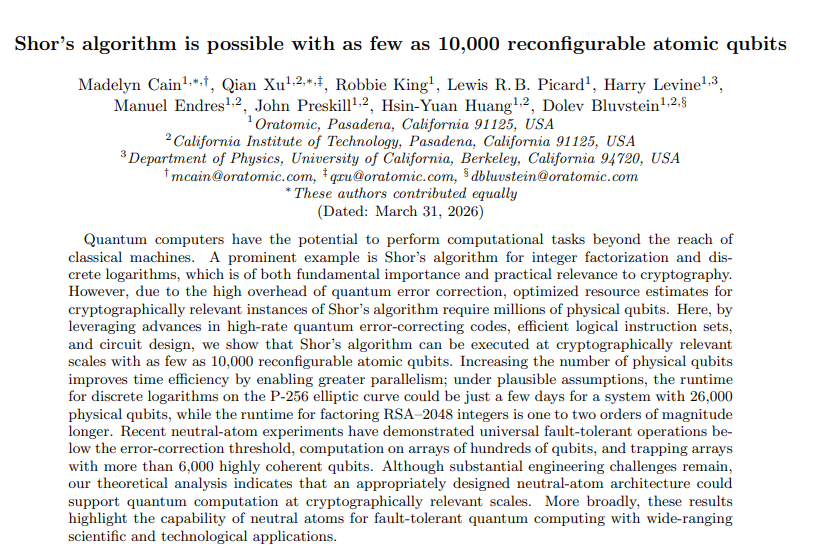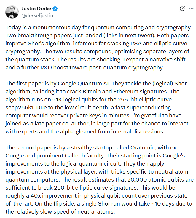 A Google egy blogposztban jelentette be az új ütemtervet. A szerzők szerint a kvantumszámítógépek jelentős fenyegetést jelentenek a jelenleg használt titkosításokra és a digitális aláírásokra. Március 30-án két fontos tanulmány jelent meg. Az egyiket Google-kutatók írták, a másikat az Oratomic nevű startup dolgozói, akik volt Google- és Caltech-mérnökök. A cikkek meglehetősen sűrű olvasmányok bárkinek, aki nem kriptográfus, de alapvetően új módszereket mutatnak be arra, hogyan lehet bizonyos kulcsfontosságú kriptográfiai rendszereket kvantumszámítógépekkel feltörni – a korábban gondolt erőforrásigény tizedével. Ez a Bitcoin szempontjából azért fontos, mert sokkal valószínűbbé válik, hogy valaki képes lesz olyan kvantumszámítógépet építeni, amely egy Bitcoin nyilvános kulcsból le tudja vezetni a hozzá tartozó privát kulcsot.
