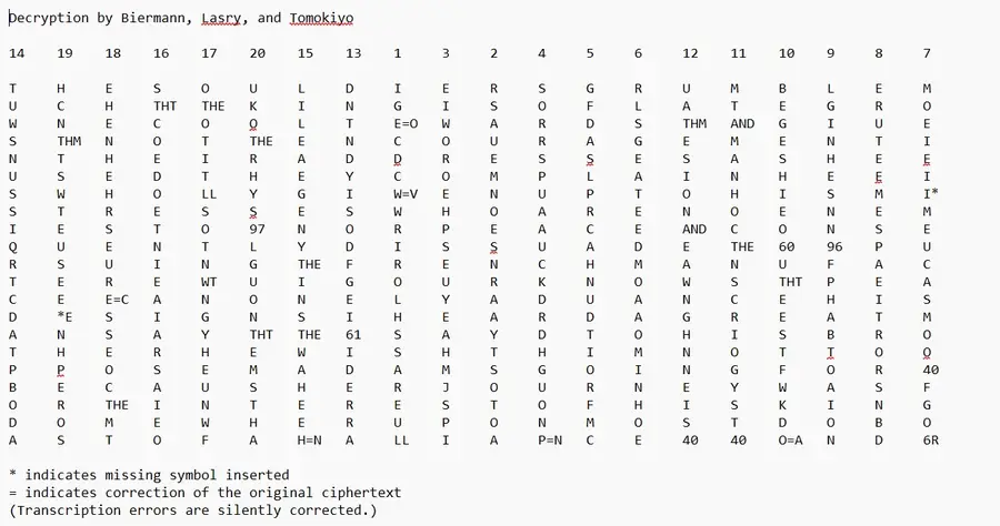 A megoldás kulcsa az volt, hogy a szöveg valójában oszlopokba rendezve állt, és ezeket az oszlopokat vissza kellett rakni a helyes sorrendbe (oszlopos transzpozíció). A kódfejtők különböző rácsszélességekkel (hány oszlop) kísérleteztek, variálták az oszlopsorrendet, közben pedig kiszűrték a feltételezett „nulla” jeleket (például a Q betűt). Azt figyelték, mikor kezdenek megjelenni értelmes angol szókapcsolatok és mondatdarabok.