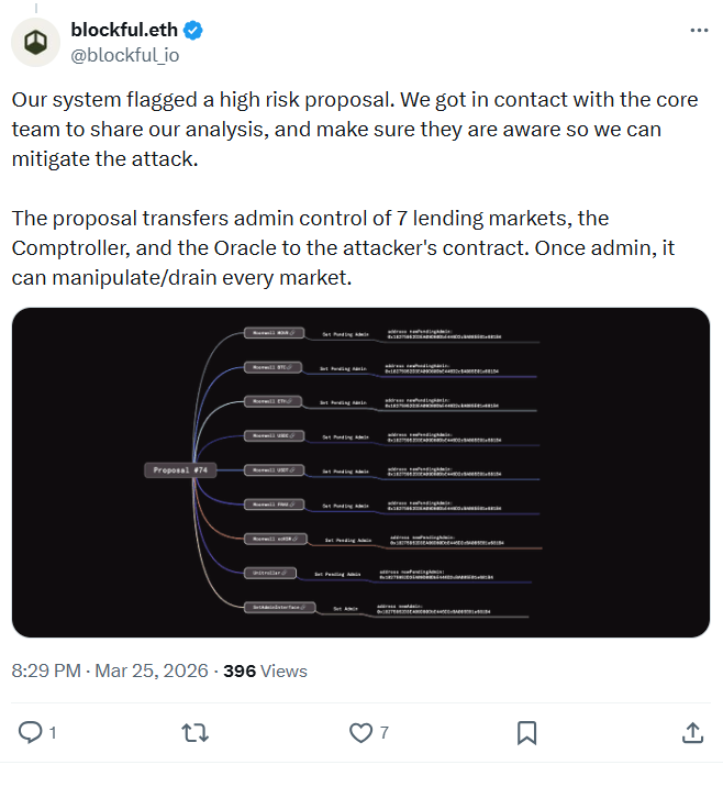 Ha a támadó javaslata átmenne, akkor teljes ellenőrzést szerezne a hitelezési protokoll kulcsfontosságú elemei felett, beleértve annak hét piacát és a protokoll alapvető okosszerződését. A Blockful blokklánc-elemző cég szerint ez lehetővé tenné a támadó számára, hogy több mint 1 millió dollárnyi felhasználói pénzt szerezzen meg.