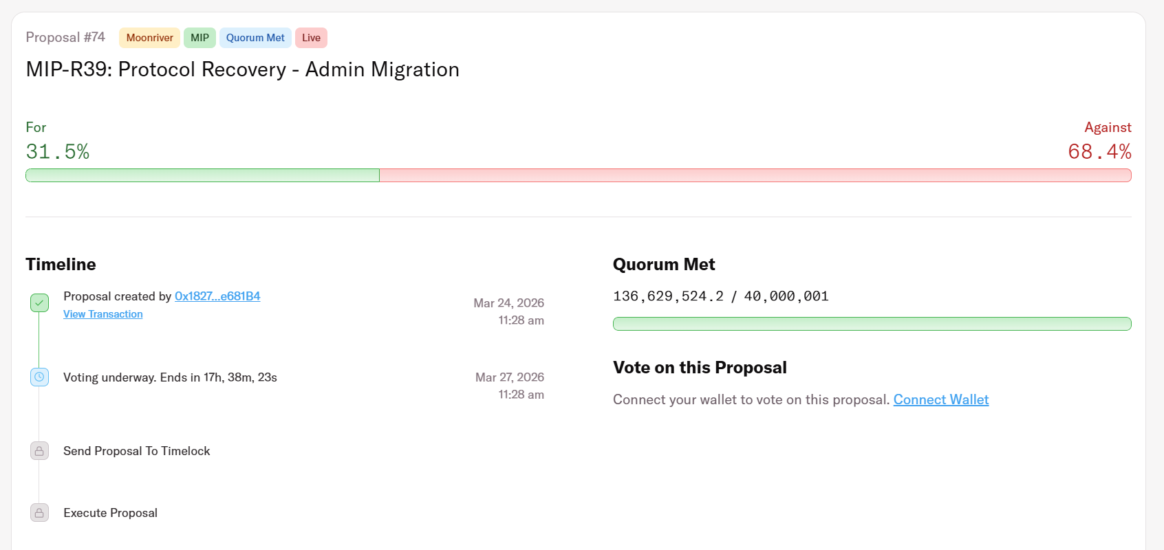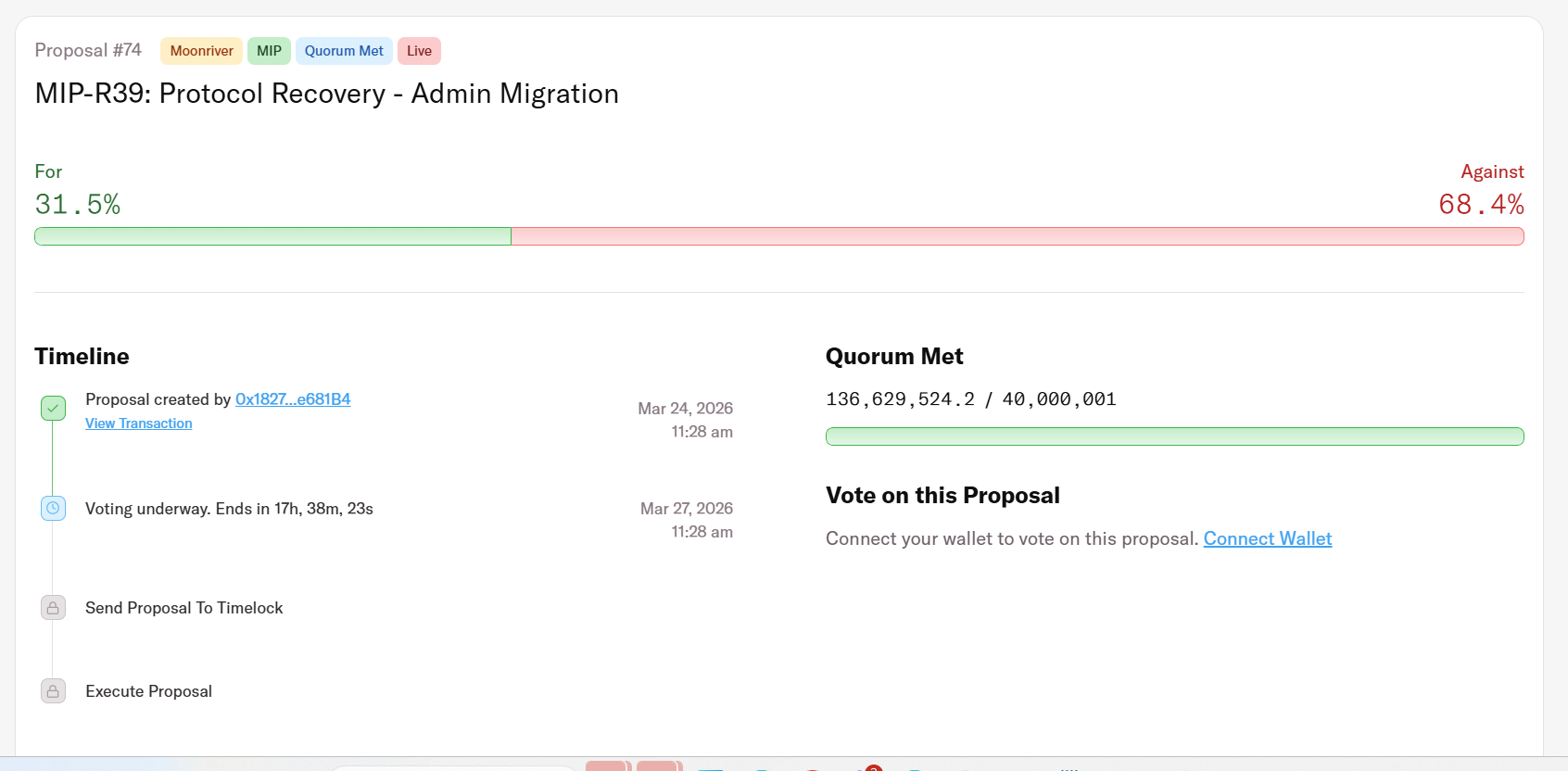 A javaslatról szóló szavazás pénteken zárul. Az MFAM, a Moonwell irányítási tokenjének birtokosai még mindig szavazhatnak a javaslat ellen, hogy megakadályozzák annak elfogadását. A javaslatra leadott szavazatok alapján a cikk írasakor a szavazatok 68%-a ellene szólt.