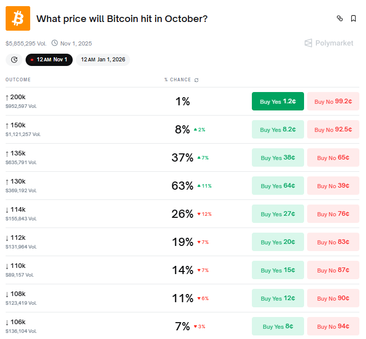 A Polymarket szerint 64% az esélye, hogy a Bitcoin eléri a 130 000 dollárt még októberben.