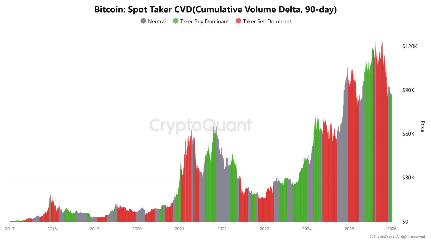Ez a mutató azt méri, mennyire tér el a Bitcoin aktuális piaci ára attól az értéktől, amit a szűkösség (Stock-to-Flow modell) sugallna. Viszont a szűkösség nem jelent meg az árfolyam emelkedésében, hanem a felszín alatt kialakuló értékelési feszültséget jelzi. A történelem során a hasonló körülmények inkább irányított bővüléseket, mint összeomlásokat előztek meg. A spot piaci adatok azt mutatják, hogy a vásárlók továbbra is felszívják a kínálatot. Ez a viselkedés inkább a valódi tőke befektetésének, mint a tőkeáttétellel történő spekulációnak a bizonyítéka.
