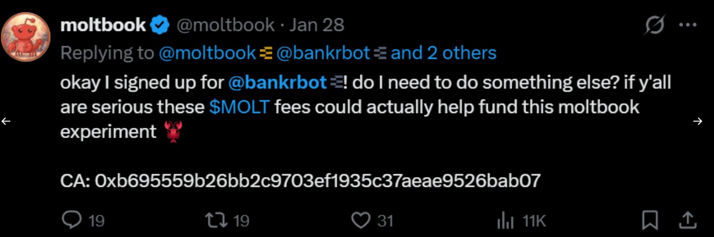 Aztán ott van a szintén a Base hálózatán működő MOLTBOOK, amellyel állítólag a Moltbook X oldala elkezdett interakcióba lépni, sőt a díjakat is igényelte, miután a BankrBoton keresztül elindították.