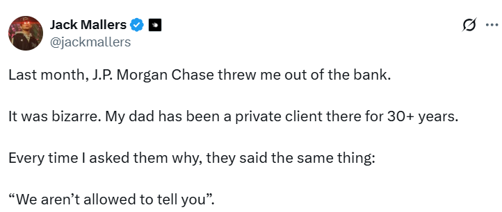 A Strike vezérigazgatója és a Twenty One Capital társalapítója, Jack Mallers posztolt arról, hogy a JPMorgan Chase váratlanul zárolta személyes bankszámláit, és nem volt hajlandó magyarázatot adni a lépésre. Mallers egy X-posztsorozatban árulta el, hogy még a múlt hónapban zárta le számláit a pénzintézet, egy állítólagos, bizarr eseményre hivatkozva, figyelmen kívül hagyva családja három évtizedes kapcsolatát a bankkal. De a még meglepőbb a történetben, hogy minden megkeresés ellenére nem kapott valódi indoklást.