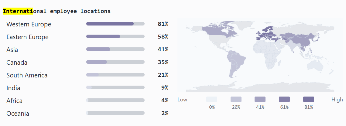 Ahogy a fenti ábra mutatja, a B és E szakaszban tartó vállalkozások 84%-a foglalkoztat alkalmazottakat Nyugat-Európában. Kelet-Európában a szám szintén magas, főleg a költséghatékonyság és az erős mérnöki tudás miatt. Ázsiában egy év alatt a duplájára nőtt a jelenlét az erős elfogadás és a hatalmas piaci potenciál miatt. Az USA közelsége és a kedvező szabályozás miatt Kanadában is erős a jelenlét, Dél-Amerikában és Afrikában viszont elenyésző.