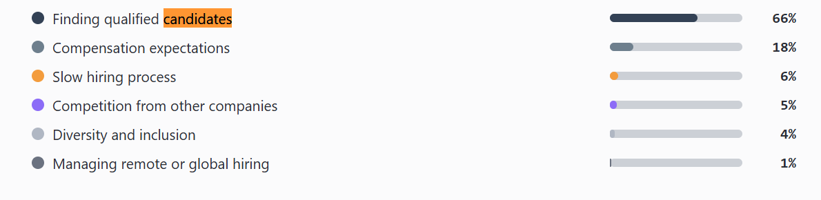 A feltörekvő kriptostartupok a távoli munkavégzés, a globális jelenlét és a modern standardok ellenére sem találnak elég képzett alkalmazottat. A cégek 66%-a szerint a megfelelő jelöltek megtalálása a legnagyobb probléma, míg 18% gondolja úgy, hogy a kompenzációs elvárások is jelentős gondot okoznak. A problémák a későbbi fázisok során erősödnek, a lassabb folyamatok és a versenykényszer miatt. Ennek ellenére, amíg lehet, a toborzást belülről oldják meg, és csak szükség esetén fordulnak ügynökségekhez.