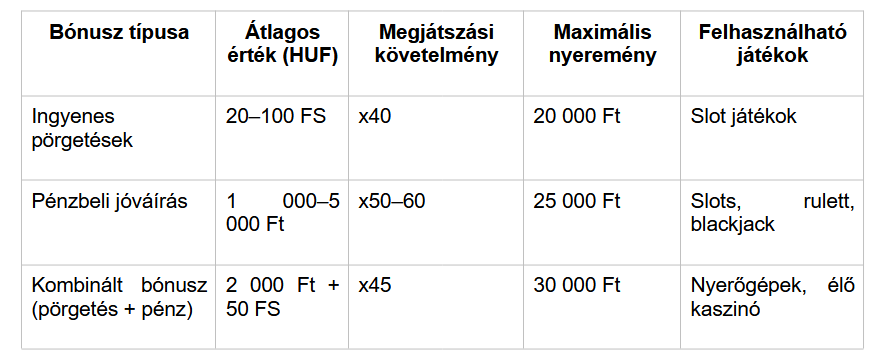 Az alábbi táblázat mutatja be a leggyakoribb bónusztípusokat és azok jellemzőit a magyar online kaszinókban: