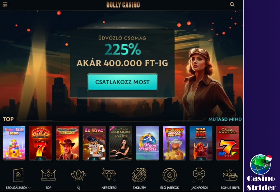 - Dolly Casino: 2021-ben nyílt meg. Több mint 10 000 játék érhető el rajta. Az oldal jól fut telefonon és számítógépen. Az új felhasználók akár 400 000 HUF bónuszt is kaphatnak három részletben.