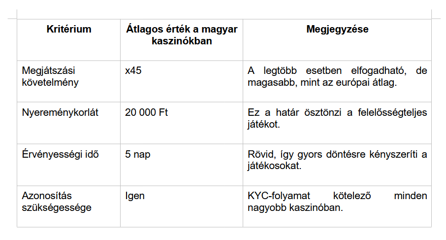 Az alábbi táblázat bemutatja a kutatási eredményeit a magyar online kaszinók bónuszfeltételeiről: