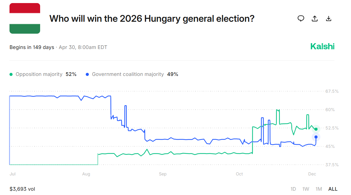 A rivális Kalshi platformján is van ilyen előrejelzési piac, amelyen 52,5%-kal ellenzéki győzelmet jósolnak a fogadók, 49% viszont kormánykoalíciós sikerre teszi a pénzét.