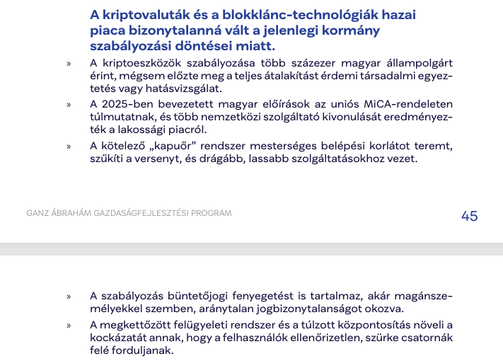A mostanában eléggé viharvert magyar kriptoszektor is kapott említést a dokumentumban a 45. és az 53. oldalakon. A program először azt részletezi, hogy a kormány közelmúltban hozott szabályai milyen módon mutatnak túl az amúgy is szigorú EU-s MiCA szabályozáson és hogyan korlátozták több százezer magyar állampolgár életét, kriminalizálva a kriptós kereskedést.
