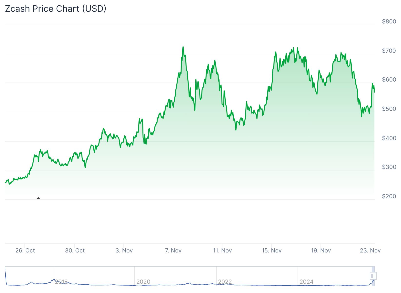 A piaci kapitalizáció alapján legnagyobbnak nevezhető privátcoin, a Zcash (ZEC) nemrég a teljes kriptoszektor egyik legnagyobb veszteségét könyvelhette el, amikor a kriptopiac teljes piaci kapitalizációja is 2,9 billió dollár alá csúszott. Persze azóta némileg már korrigált a piac, a Zcash aktuálisan már 566,74 dolláron áll, ami az elmúlt 24 órában látható 12%-os visszapattanásnak is köszönhető.