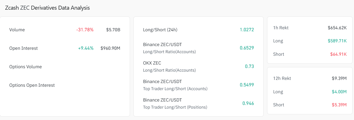 A legutóbbi lefelé irányuló nyomás nagy részét a derivatív piacok adják. Ezeken a piacokon 31%-os visszaeséssel 5,7 milliárd dollárra esett vissza a forgó tőke, viszont a nyitott pozíciók értéke 960 millió dollár fölé mozdult be. Az ilyen mozgások általában a kereskedők növekvő bizonytalanságát tükrözik, ahogy felkészülnek a ZEC volatilitásának növekedésére.