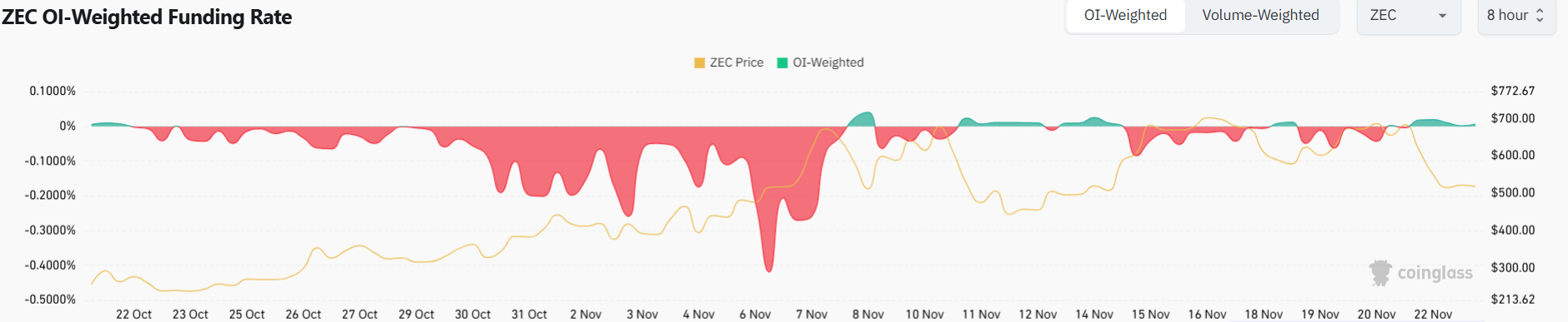 Az Open Interest–weighted Funding Rate egy olyan mutató, amely a kriptotőzsdék örökös határidős szerződéseinek finanszírozási rátáját súlyozza az adott piacon lévő nyitott pozíciók összértéke alapján. Ez így pontosabb képet ad a piaci hangulatról, mint ha csak az egyszerű átlagot néznénk. Az, hogy ez pozitív, arra utal, hogy egy potenciális fellendülés közeledhet, és hogy a közelmúltbeli visszaesés csak egy rövid szakaszt jelenthet a ZEC általános piaci mozgásában.