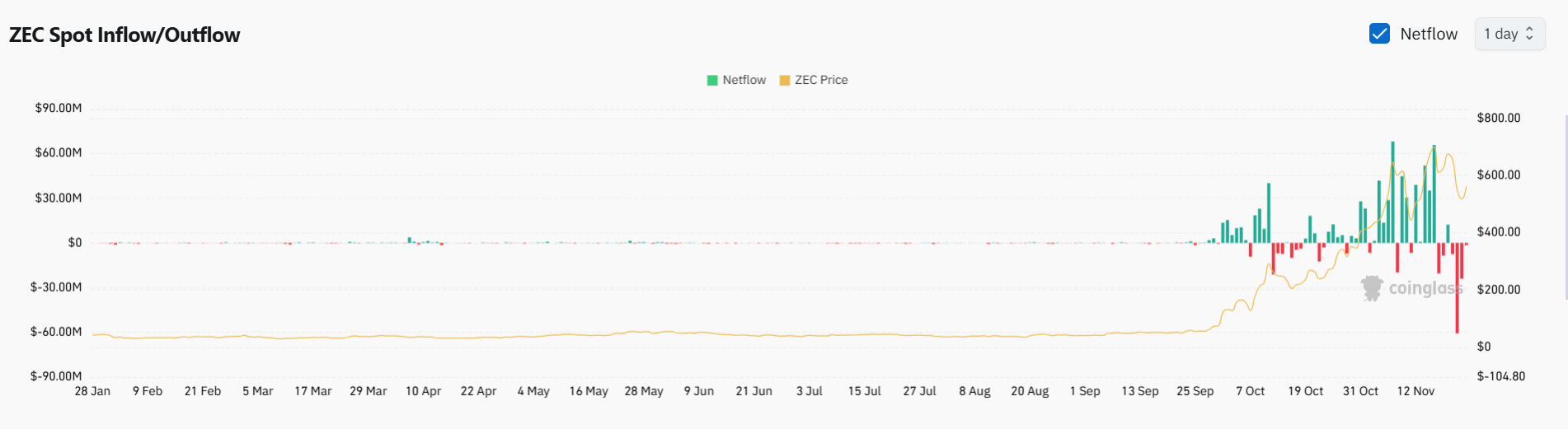A Coinglass adatai szerint a befektetők a folyamatos esés ellenére is folytatták a ZEC felhalmozását és a spot felhalmozás összértéke elérte a 72 millió dollárt, ami jelentős összeg. Pozitív hangulatot mutat, amelyben a „buy the dip” mentalitás vált az uralkodó narratívává. Aktuálisan viszont inkább kiáramlás látható, november 21-én és 22-én is jelentős összegek hagyták el a spot piacot: