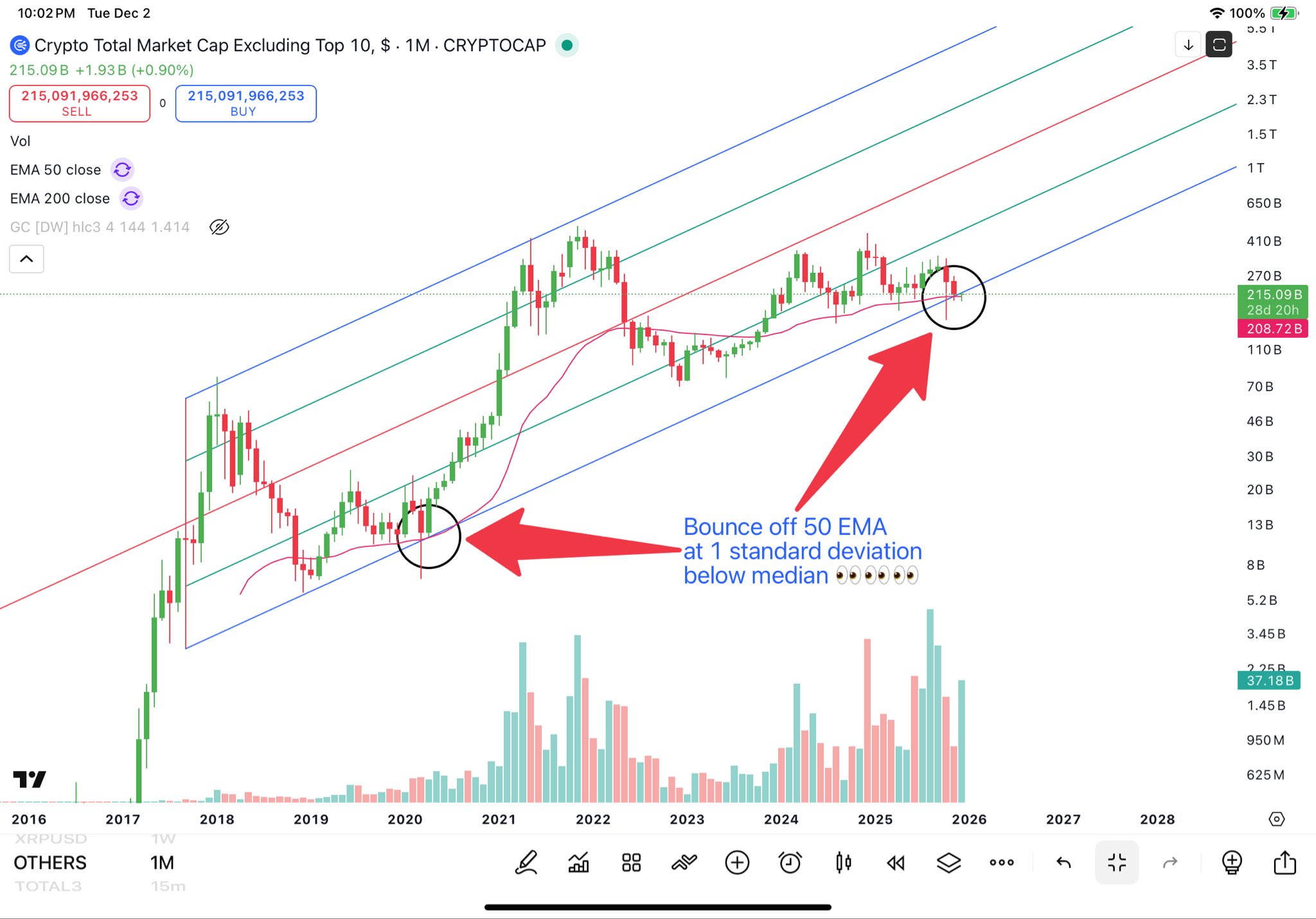 Az alábbi grafikonon remekül látszik, hogy az OTHERS, vagyis a tíz legnagyobb kriptovalután kívüli, index jelenleg az 50 napos mozgóátlagot érinti, melyről egyszer már 2019-2020 folyamán visszapattant. Rövid távon természetesen továbbra is nagy a bizonytalanság, ugyanakkor hosszabb távon, különösen a likviditás bővülésével, az új ETF-fel rendelkező altcoinok, az L2-k, valamint a DeFi-termékek különösen vonzóak lehetnek.