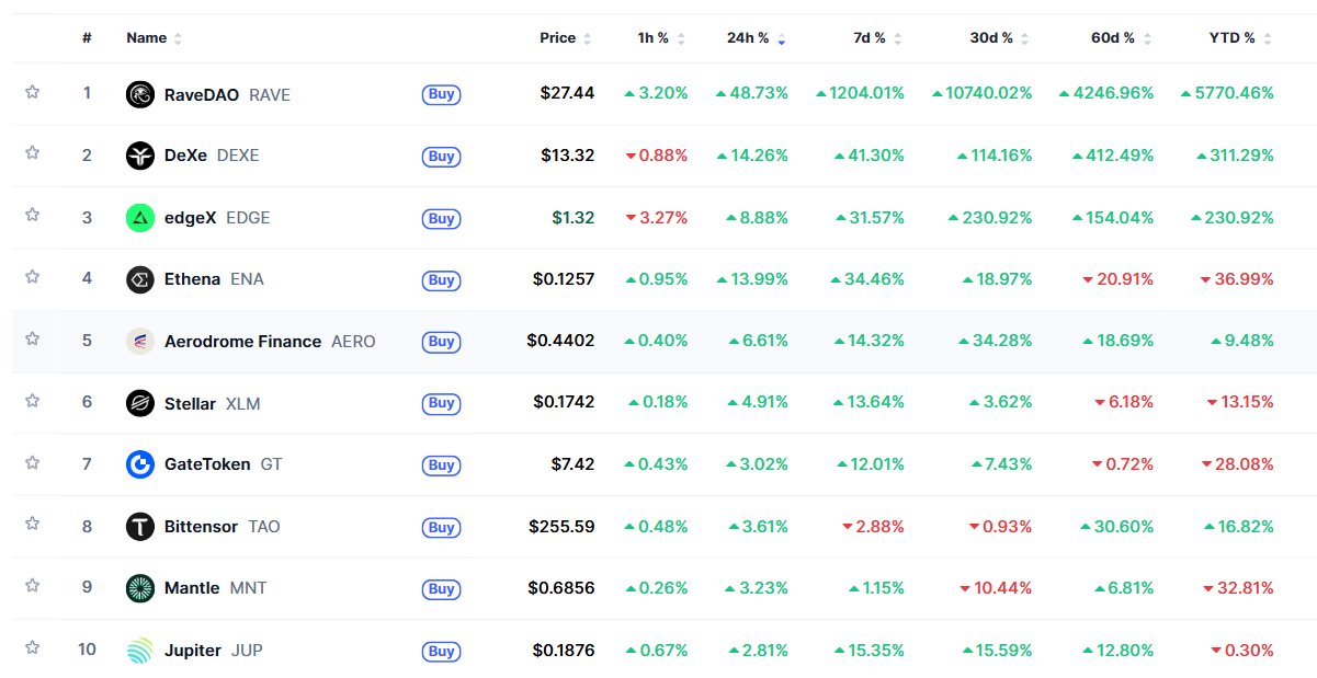 (ETH), amelyek 6%-os-, illetve 8%-os növekedést produkáltak az elmúlt héten. Ez már önmagában indikálja azt, hogy az alattuk helyezkedő altcoinok növekedése akár kétszámjegyű is lehet: a RaveDAO tokenje a semmiből emelkedett 1170%-ot, azonban a nagyobb altcoinok közül érdemes kiemelni a Celestia TIA tokenjét, amely 42%-ot erősödött, az Ethena ENA-ját, amely túl van egy 33%-os ugráson, valamint az AAVE-t, amely 26%-kal értékelődött fel múlt hét szombat óta.