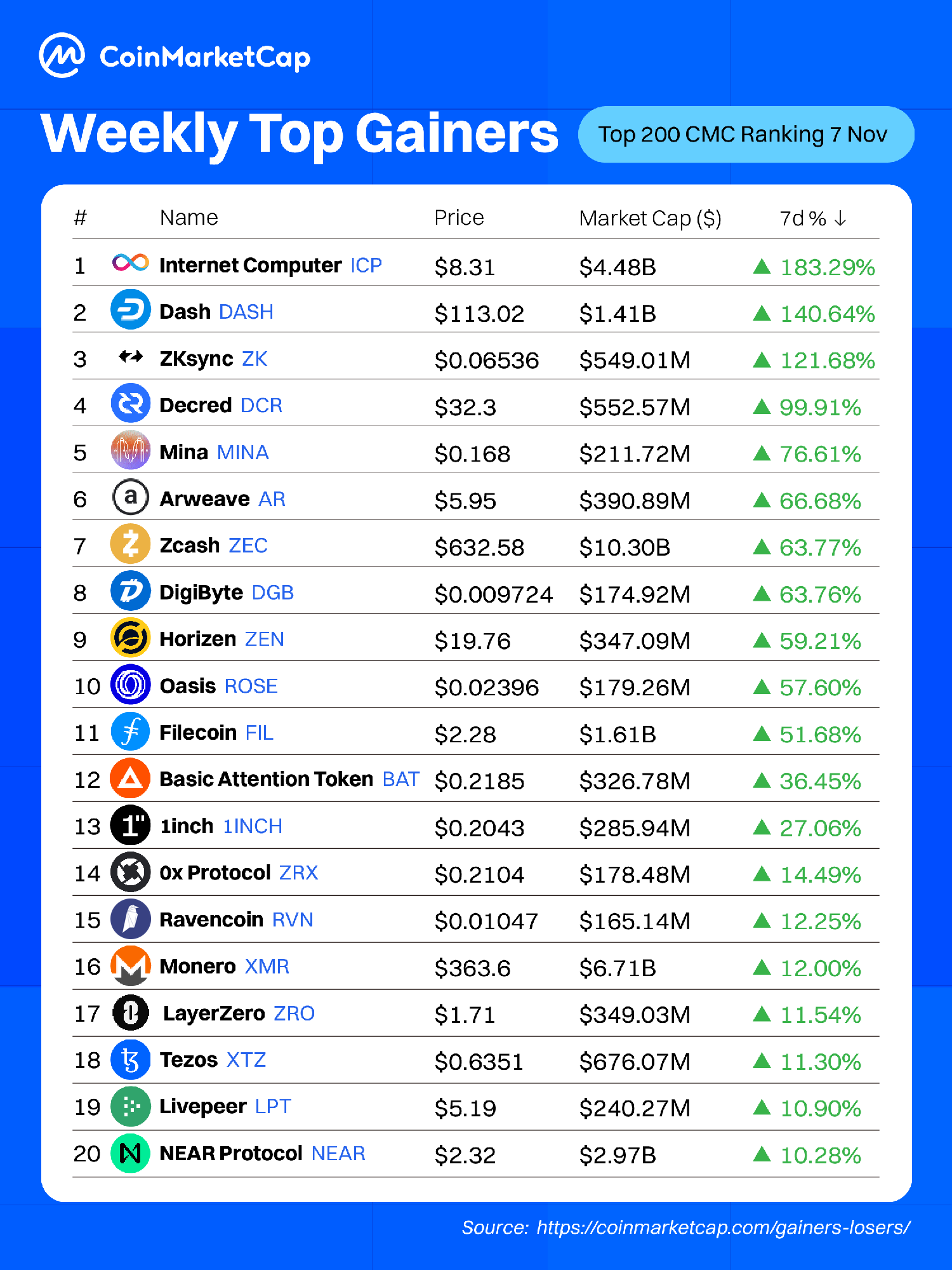 Annak ellenére, hogy az összképet nézve az altcoinok messze elmaradnak ebben a ciklusban a BTC-től, érdemes néhány szereplőt kiemelni – különösen az AI-szektorból – akik kifejezetten jól teljesítettek a november 7-i adatok szerint: