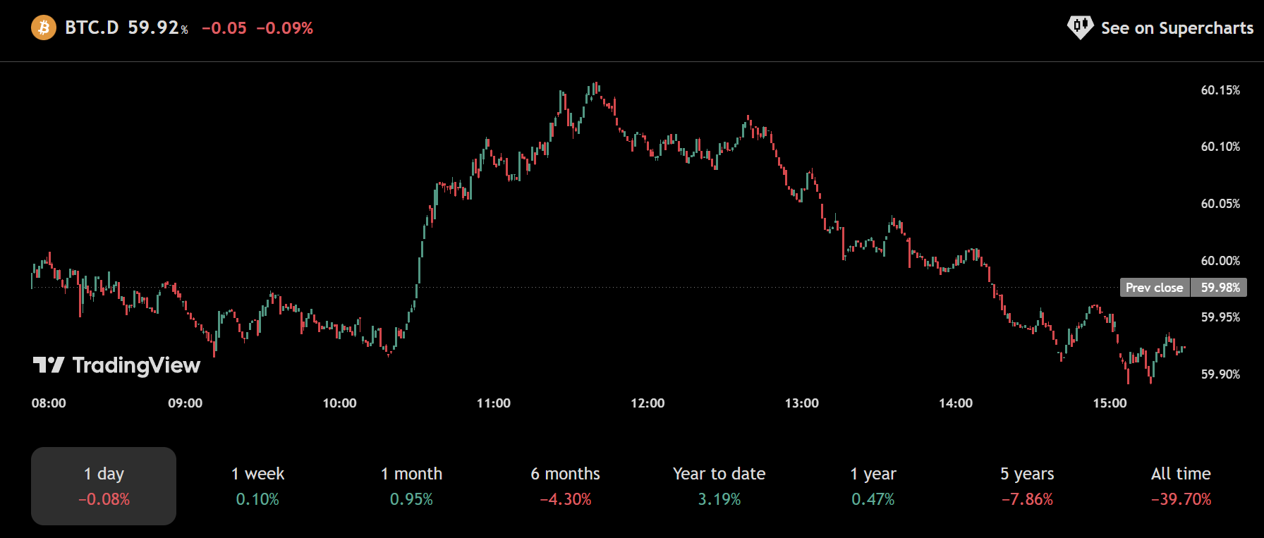 (BTC) a 102 000 dolláros szint megtartásával küzd, miután az elmúlt héten sikerült viszonylag gyorsan talpra állnia a százezer dolláros szint megtörését követően. Ennek ellenére, a piac egészére vetített bitcoin-dominancia megtörte a 60%-os támaszt, jelenleg pedig 59% körül ingadozik.