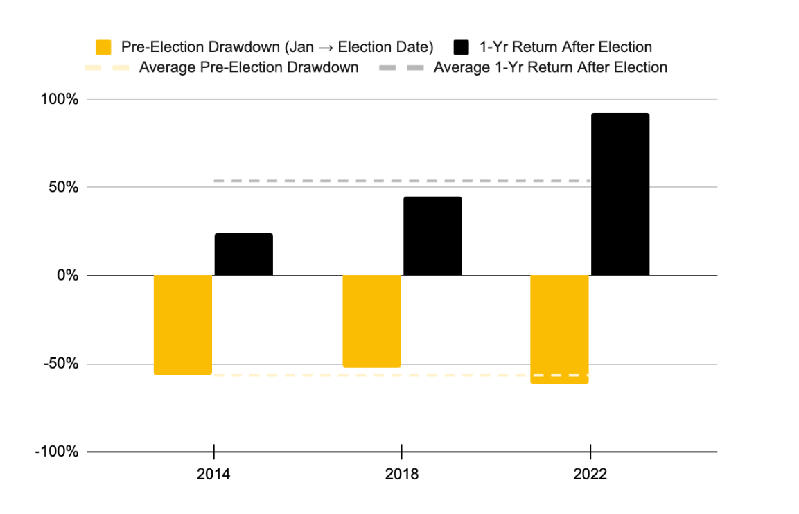 A BTC árfolyamának alakulása egy évvel a félidős választások előtt és után Forrás: Binance Research
