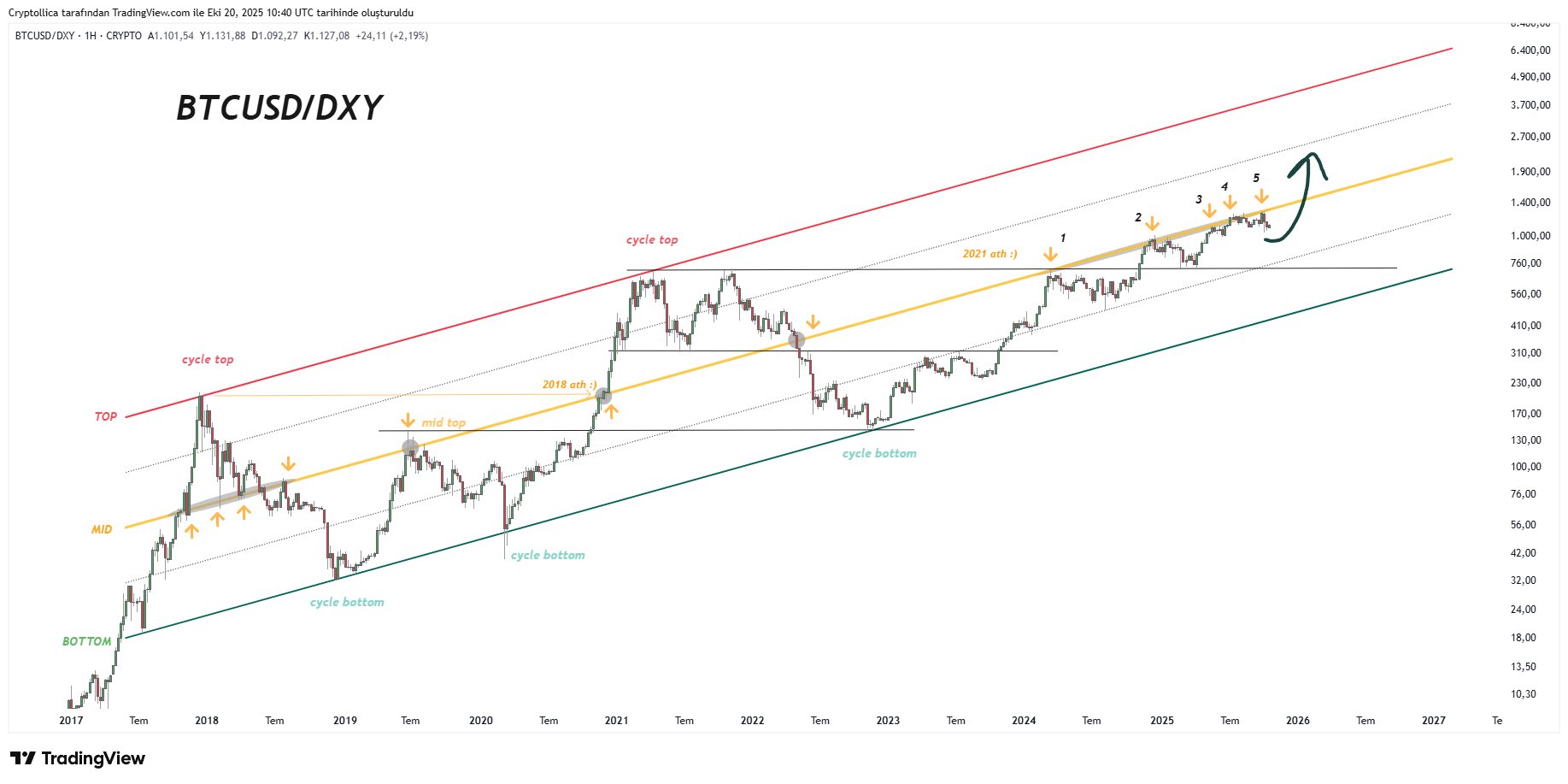 Ahogyan az a csatolt grafikonon is látszik, a BTC/DXY kereskedési pár még messze van a már 2017-ben és 2021-ben látott csúcstól, ugyanakkor a középső szakaszt egyelőre ötször próbálta megtörni a BTC – mind sikertelen próbálkozás volt.