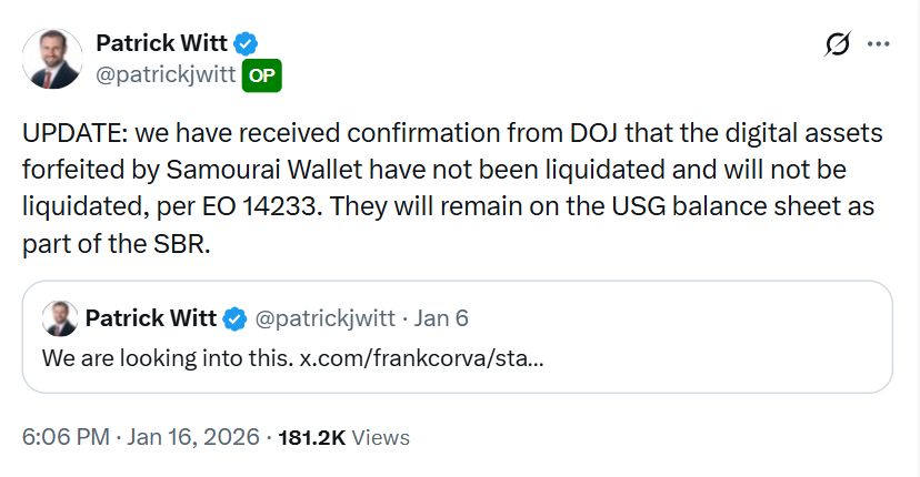 „Megerősítést kaptunk az Igazságügyi Minisztériumtól, hogy a Samourai Wallet ügyében lefoglalt digitális eszközöket nem adták el, és nem is fogják az EO 14233 értelmében. Minden bitcoin az amerikai kormány mérlegében marad a stratégiai bitcoin tartalék részeként”