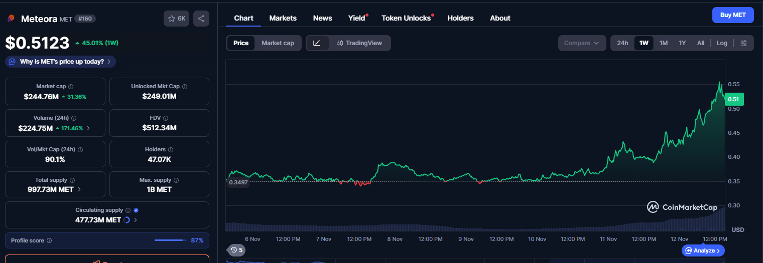 Az airdrop utáni visszaesésből kilábalva újra lendületbe jött a Meteora, és rövid időn belül 30%-os emelkedést produkált. A Solanán futó DeFi platform célja a mémcoin gyártás és kereskedelem forradalmasítása, az elemzők szerint pedig előbb-utóbb az egyik vezető DEX versenytársát, az Uniswapot is megelőzheti.