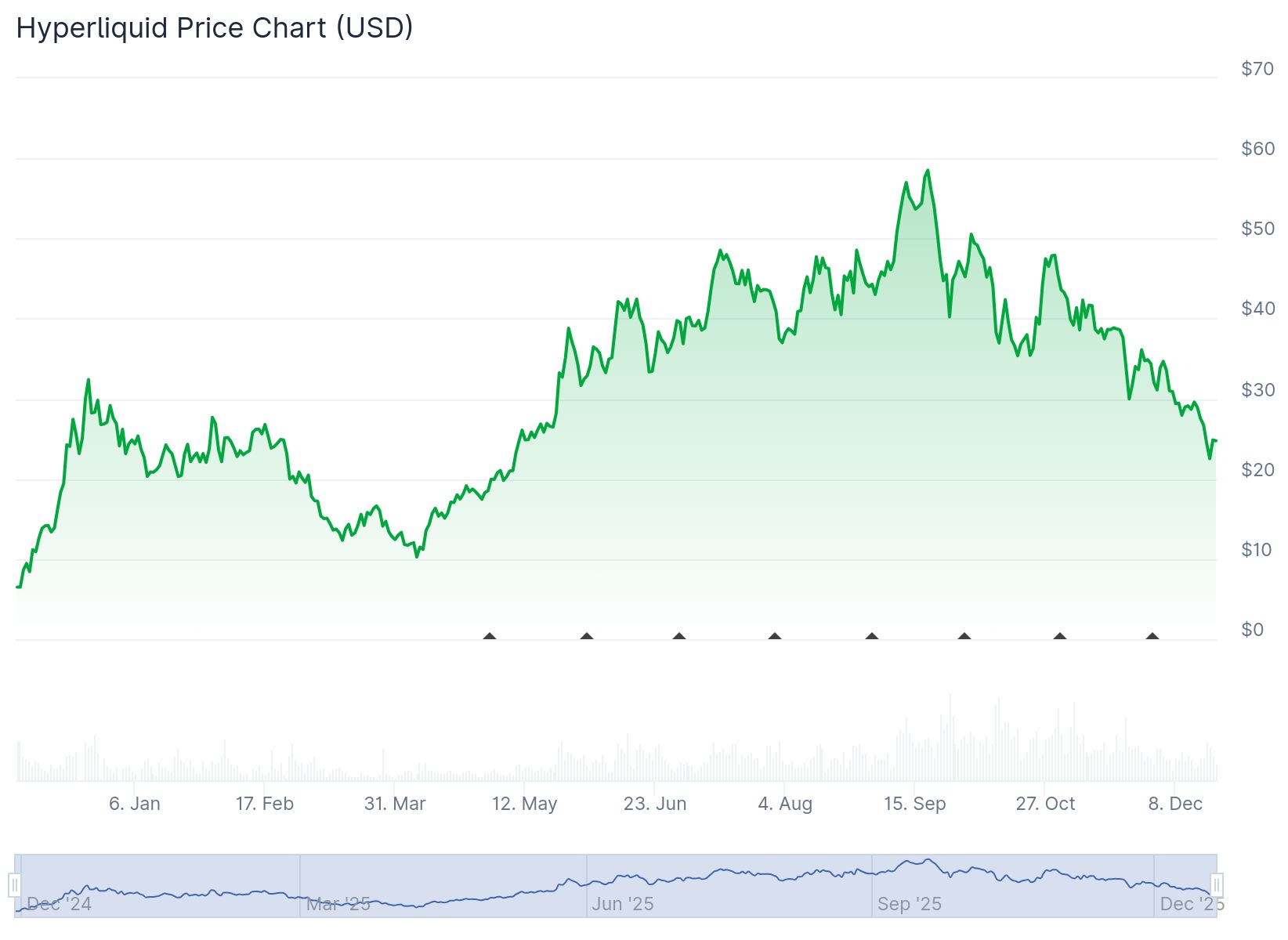 Hayes a Hyperliquidet emelte ki, mint a mostani ciklus egyik legjobb történetét, rámutatva, hogy alig pár dollárról egészen 60 dollárig emelkedett a coin ára. Persze látni kell, hogy a HYPE árfolyama a cikk írásakor 24,7 dollár környékén mozog csak, miután az elmúlt három hónapban 54 dollárról 54%-ot veszített az árából.