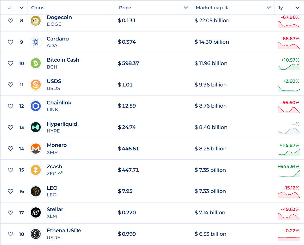Egyes kereskedők még mindig a hagyományos menetrendet árják amelynek során először a Bitcoin éri el az új csúcsokat, majd a tőke az etherbe, végül pedig a kisebb altcoinokba áramlik. A legtöbb elemző, így a Bitfinex elemzői úgy látják, hogy az altcoinok addig valószínűleg nem fognak széles körű, kiugró emelkedést tapasztalni, amíg nem hagyják jóvá azokat az ETF-eket, amelyek kitettséget biztosítanak a kisebb coinokra is. Ha megnézzük az elmúlt 1 évben zöldben teljesítő altcoinokokat, akkor azt láthatjuk, hogy a többség nem tudta tartani év elején elért árfolyamát, viszont vannak páran a legjobb altcoinok között, amelyek szépen tudták lehozni 2025-öt.