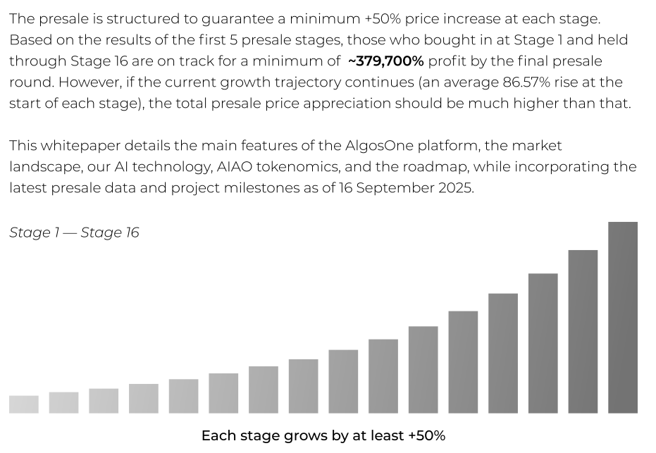 Az AlgosOne mesterséges intelligencia alapú kereskedési platform saját tokenjének (AiAO) előértékesítése javában zajlik, fokozatosan emelkedő árakkal. Maga a folyamat 2025 elején kezdődött és most tartanak a 9. szakasznál a tizenhatból. Az AlgosOne egy EU‑ban engedélyezett AI‑vezérelt kereskedési rendszer, amely kriptók, részvények és más eszközök automatizált kereskedését kínálja. Az AiAO token az AlgosOne natív kriptoeszköze. A rendszer gépi tanulási technikát és természetes nyelvi feldolgozást (NLP) használ, hogy hatékony kereskedési lépéseket hajtson végre emberi beavatkozás nélkül. Ez most nagyon nagy trend, a legnagyobb kriptotőzsdék is alkalmazzák.
