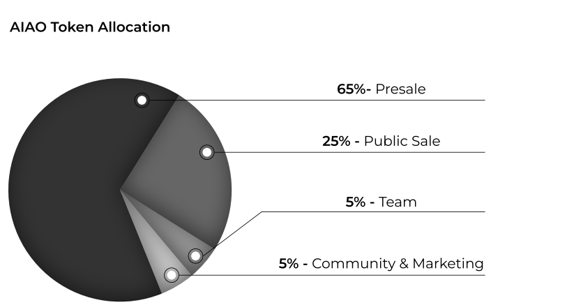 Az AiAO tokenjének teljes kínálata 1 milliárd token, amelyből az előértékesítésben 65%-ot értékesítenek, 25% nyilvános értékesítésre marad, a fejlesztői csapatnak marad még 5% (3 éves lejárattal) és közösségi ösztönzére is 5%.