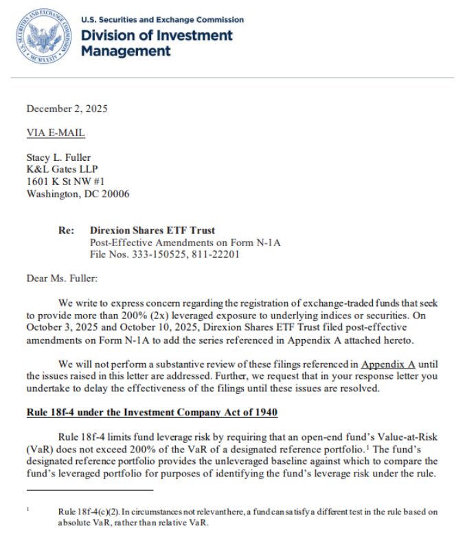 A Direxion, ProShares és Tidal cégeit arra szólította fel a SEC, hogy módosítsák beadványaikat. A hatóság úgy ítélte meg, hogy ezek a magas kockázatú termékek megsértenék az 1940-es Investment Company Act által meghatározott tőkeáttételi korlátokat. Az USA-ban már léteznek magas tőkeáttételes ETF-ek részvényindexekre, de kriptók esetén ilyen szintű tőkeáttételes terméket nem engedélyeztek még. A SEC felszólításában kiemelte az 1940-es törvényt, amely korlátozza, hogy egy alap mennyit kockáztathat a tőkeáttétellel nem rendelkező referencia portfóliójához képest. A törvény szerint a kockázat nem haladhatja meg a 200%-os kockázati értéket, ami azt jelenti, hogy minden olyan ETF, amely háromszoros vagy ötszörös hozamot biztosít, automatikusan kizárt. Szokatlan lépésként a SEC a figyelmeztető leveleket még aznap nyilvánosságra hozta, amikor kiadta őket. Ez elemzők szerint egyértelmű üzenet a kibocsátók felé, különösen most, amikor a kriptoeszközök volatilisebb időszakban vannak.