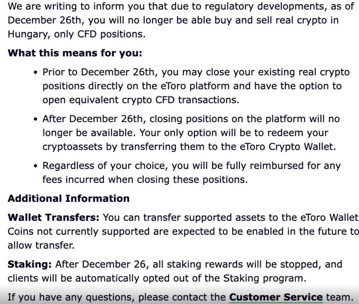 December 26-ig mindenki lezárhatja a kriptós pozícióit és lehetősége van újra megnyitni ezeket CFD-n, azaz különbözeti szerződéses tranzakción keresztül. Ezzel már csak az árfolyamváltozásra spekulál a kereskedő, nem lesz tényleges kriptoeszköz a birtokában. December 26-a után már ez az opció sem marad meg, akkor már csak ki lehet mozdítani a támogatott kriptoeszközöket egy eToro kriptotárcába. És a határidő után a magyar ügyfeleket ki fogják zárni a stakelési programból is, nem lesz már lehetőség stakelési jutalmakat szerezni.