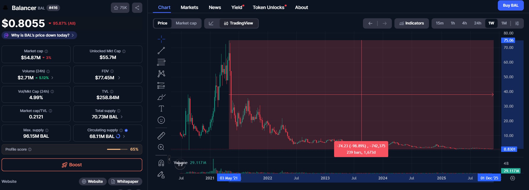 A Balancer tokenje ($BAL) a bejelentést követően sem tudott 1 dollár fölé emelkedni, jelenleg 0,80 dollár körül kereskedik. Az elmúlt egy évben közel 71%-ot veszített az értékéből, a történelmi csúcshoz (75 dollár – 2021. május 4.) képest pedig mintegy 99%-os mínuszban van a cikk írásakor. Piaci kapitalizációja alapján a 416. helyen szerepel, ami érthető aggodalmat kelt a befektetőkben. A közelmúlt ármozgásai alapján a protokoll kilátásai jelenleg kockázatosnak tekinthetők.