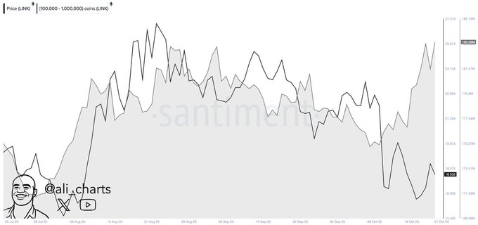 A Santiment kutatásai megerősítették, hogy a százezer – egymillió LINK-et birtokló tárcák tulajdonosai az elmúlt 12 hónapban további 40 millió LINK-et vásároltak, ami 28%-os növekedést jelent a korábbi eszközállományhoz képest. A felhalmozás különösen a legutóbbi piaci korrekció után gyorsult fel. A Lookonchain elemző szerint 30 új tárca összesen 6,26 millió LINK-et – mintegy 116,7 millió dollár értékben – vont ki a Binance-ről október 11. óta. Ez arra enged következtetni, hogy a nagytőkés szereplők igyekeznek minden áresést kiaknázni.
