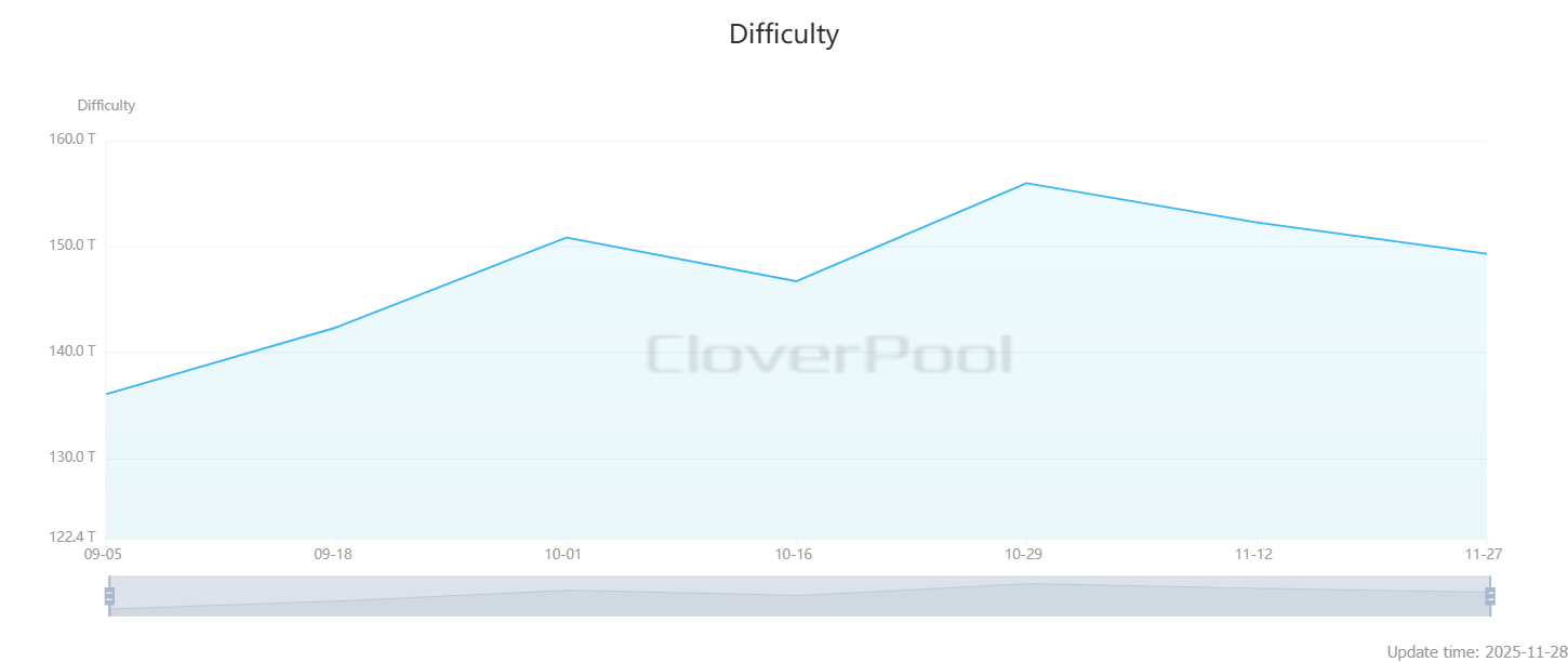 A Cloverpool adatai szerint a Bitcoin bányászat nehézsége november 27-én, a 925 344. blokk magasságán körülbelül 2%-kal, 149,30 billióra csökkent. Ez volt a második egymást követő csökkenés ebben a hónapban, de a blokkintervallumok továbbra is makacsul közel maradnak a tízperces célhoz.