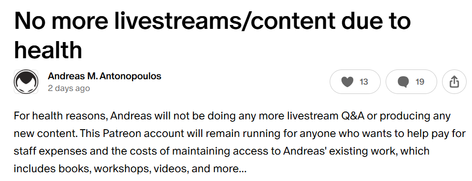 A publicista Patreon-oldalán jelentette döntését, amelyet egészségügyi okokkal indokolt. Ezek az okok már befolyásolták azt a munkatempót, amelyet az elmúlt évtizedben tudott tartani. Antonopoulos nem közölt konkrét részleteket betegségéről, csupán arról tájékoztatott, hogy felfüggeszti rendszeres tevékenységeit.