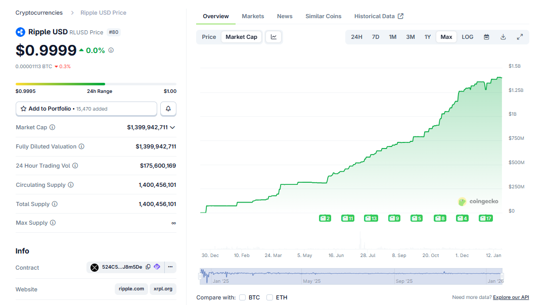 A CoinGecko információ szerint a Ripple-höz köthető stabilcoin összértéke jelenleg 1,4 milliárd dollár, mellyel a 80. legnagyobb kriptovalutának számít a piacon. A csatolt grafikonon jól látható, hogy a piaci kapitalizáció folyamatos növekedést követ, ez pedig a megbízható tartalékeszközöknek (T-bill, FDC-biztosított betétek) is köszönhető, melyek havonta auditálva vannak az NYDFS felügyelete által.