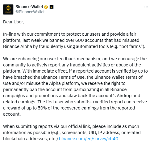 A Binance Wallet a múlt héten több mint 600 fiókot tiltott le a Binance Alpha programban elkövetett visszaélések miatt, egy új bejelentés szerint.