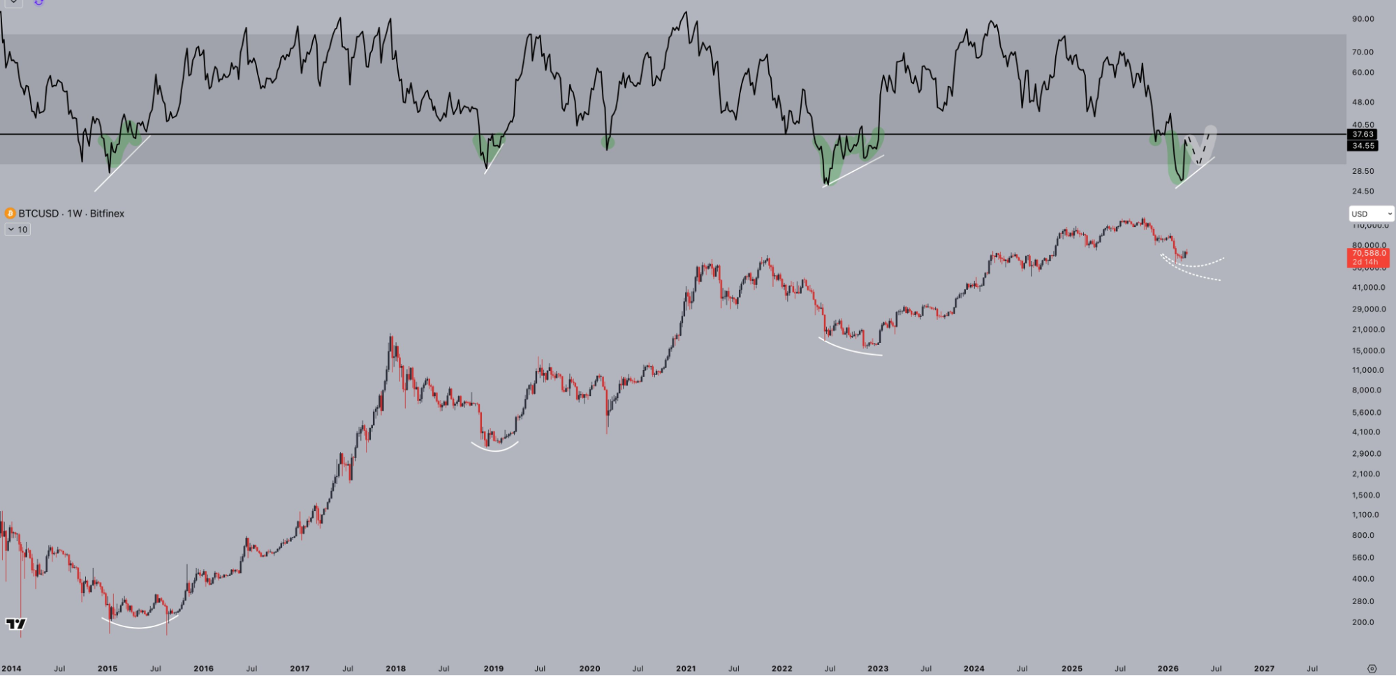 Jelle kereskedő szerint most is hasonló helyzet alakulhat ki. Úgy véli, ha a heti RSI egy magasabb mélypontot alakít ki, az erős jelzés lehet arra, hogy a piac közel jár a fordulóponthoz.