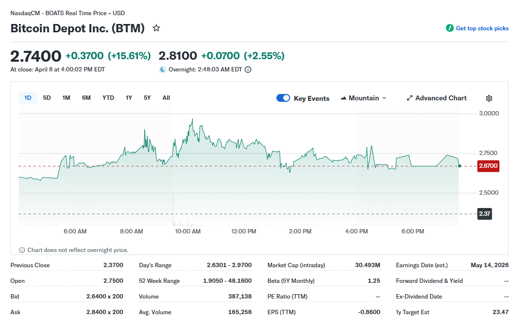 Bár egy ilyen incidens alapjaiban rengetheti meg a bizalmat egy szolgáltató iránt, a Bitcoin Depot részvénye, a BTM, meglepően emelkedéssel reagált: természetesen ebben közrejátszik az is, hogy az Egyesült Államok és Irán tűzszünetet kötött, ugyanakkor a 16%-os emelkedés egyetlen kereskedési nap alatt szokatlanul erős egy adatbiztonsági hibát követően.