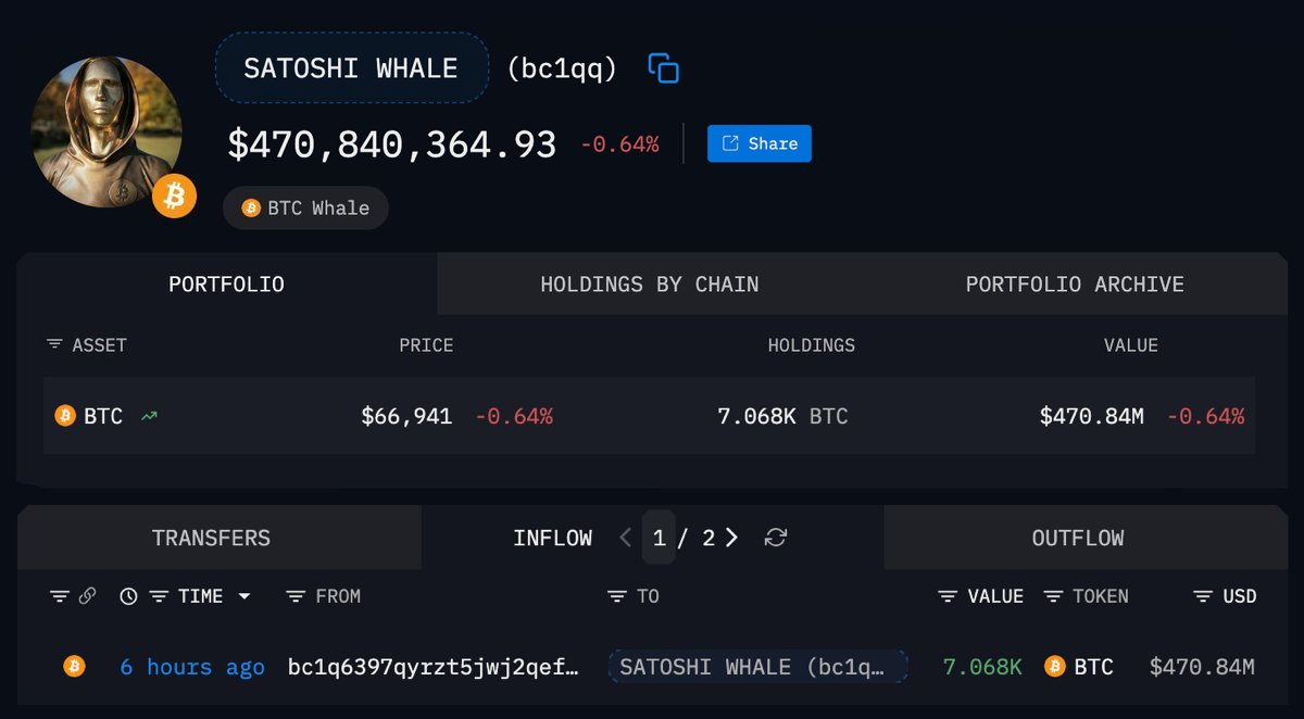 Az Arkham Intelligence blokklánc-analitikai portál figyelt fel rá, hogy egy úgynevezett Satoshi-bálna tárcája (bc1qq…) 14 év inaktivitás után ismét mozgásba lépett. A tárca ismeretlen tulajdonosa péntek késő esti órákban 7068 BTC-t vásárolt több mint 470 millió dollárért, amit a hálózati adatokból olvasott ki az elemzőcsapat.