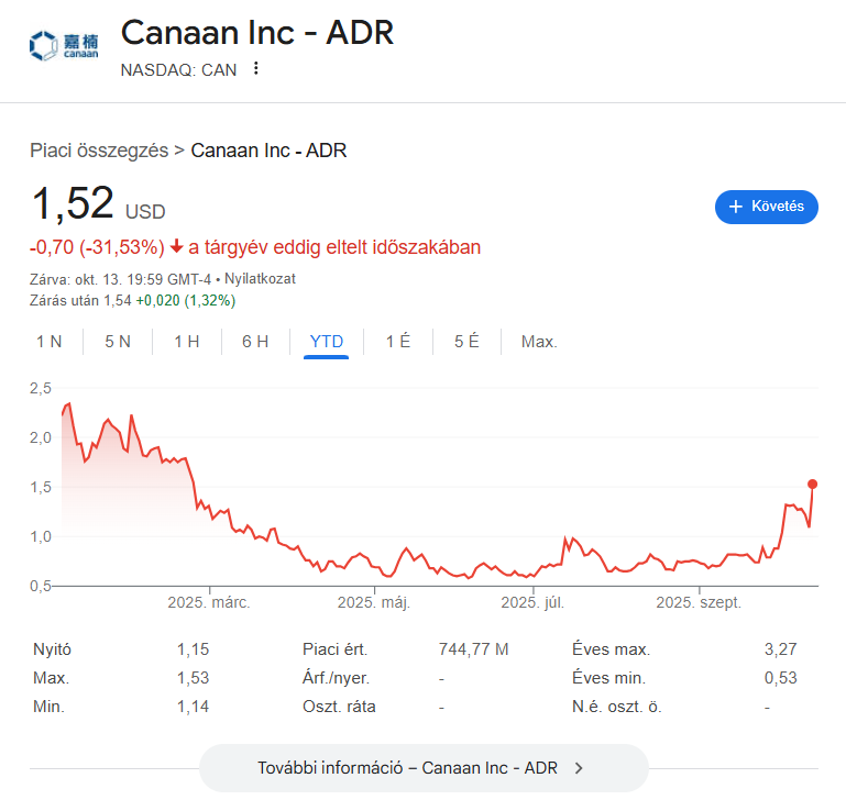 Fordulatot az jelentett azonban a Canaan számára, hogy októberben nemcsak a gázprojektet jelentették be, hanem történetük legnagyobb – 50 ezer darabos – gépmegrendelésével is piacra léptek az USA-ban. Ez a két tényező kombinálva új lendületet adott a részvénynek, hiszen az AI-adatközponti együttműködések révén diverzifikálni tudják tevékenységüket.