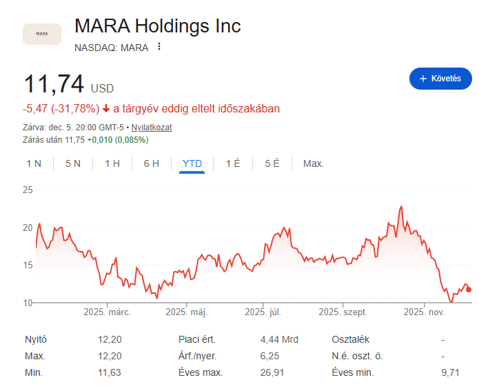 Cikkünk írásakor a MARA részvénye 11,74 dolláron áll. Idén közel 32%-ot vesztett az értékéből.