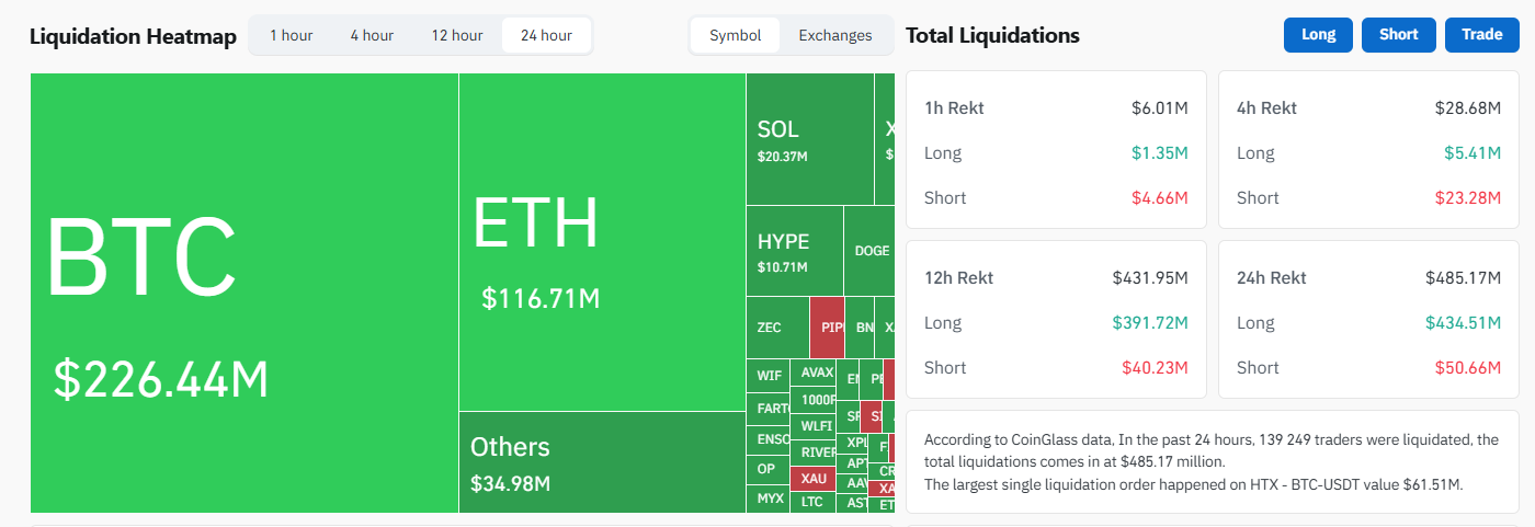 A hálózati adatok szerint a bálnák indították be a hétfői esést: a nagy tárcákból jelentős mennyiségű BTC áramlott be a tőzsdékre, ami a potenciális eladás indikátoraként jelent meg. Ezt követte a dominószerű likvidáció a tőkeáttételes piacon: a CoinGlass adatai szerint az elmúlt 24 órában közel félmilliárd dollárnyi pozíciót számoltak fel, közel 140 ezer kereskedő érintett és ennek java a vételi (long) pozíciókat érinti – 434 millió dollár értékben.