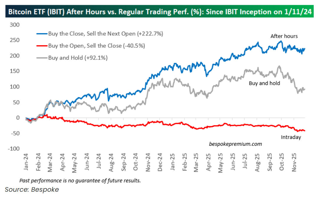 A koncepció nem véletlenül hívta fel magára a figyelmet. A Bespoke Investment Group szerint, ha egy befektető idén január óta az iShares Bitcoin Trust ETF-fel csak zárás után vásárolt és nyitáskor adott el, 222%-os hozamot ért volna el. Ugyanakkor azok, akik nappal kereskedtek – azaz nyitáskor vettek, majd záráskor adtak el – 40,5%-os veszteséggel zártak. Ez a hatalmas különbség az úgynevezett „AfterDark” stratégia alapja.