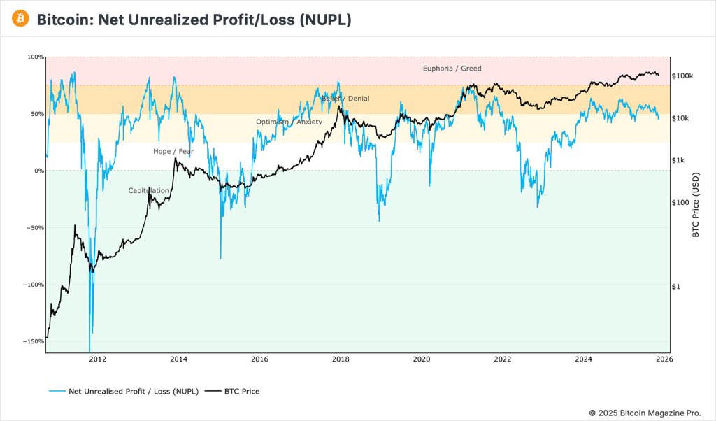 A mostani eladási hullámokkal párhuzamosan komoly változások figyelhetők meg a piaci hangulatban és a hosszú távú árfolyam-ciklusokban is. A Net Unrealized Profit/Loss (NUPL) mutató aktuális értéke alapján a piac az „elutasítás” és a „félelem” fázisok között mozog, vagyis sok befektető még nem akar szembenézni a lehetséges hosszabb távú korrekcióval, mások viszont már egyre inkább aggódnak a további leértékelődéstől.